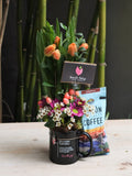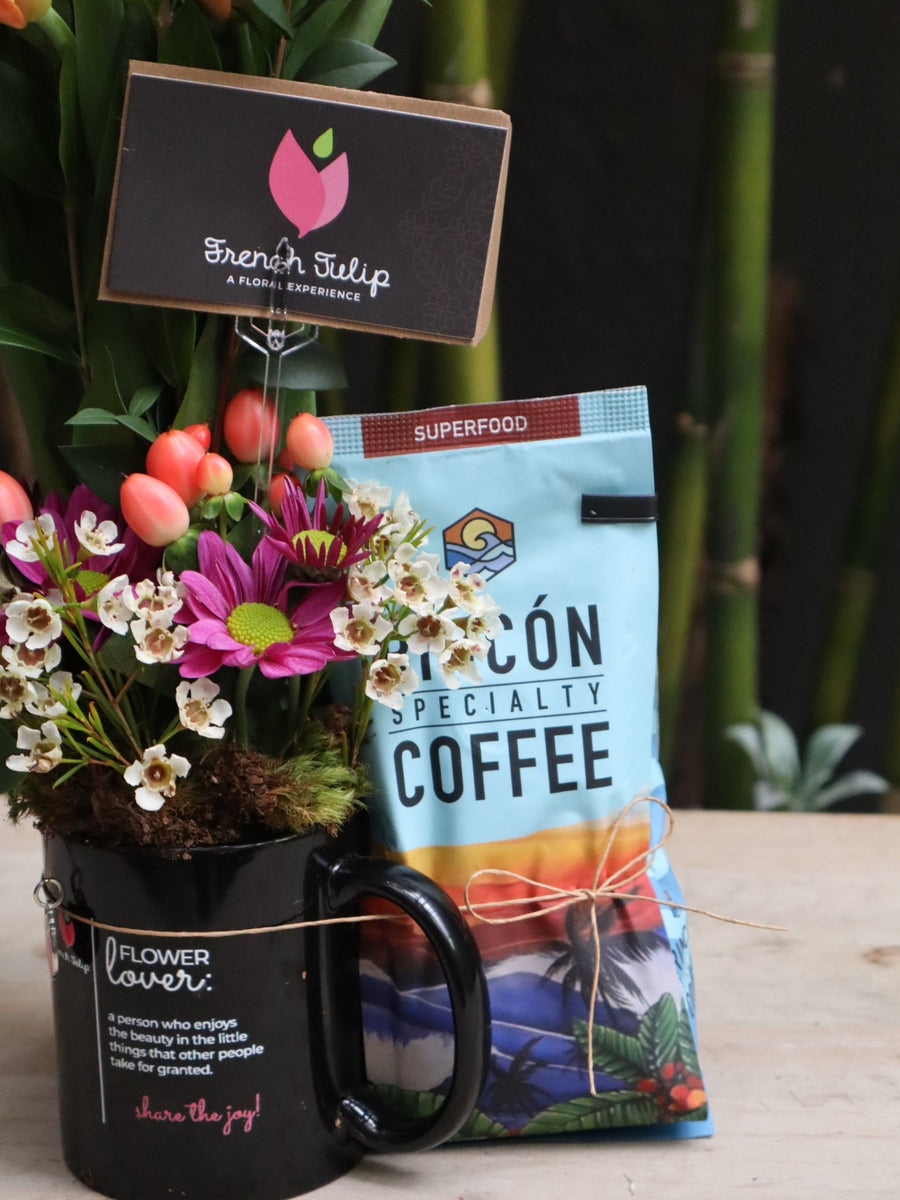 This unique flower arrangement is made on a coffee mug and comes with a bag of Rincon Specialty Coffee. Enjoy its rich, flavorful notes of wood, vanilla, and chocolate, with a light acidity and delight your sight with a combination of tulips, greenery, daisies & hypericum - all in one cup!