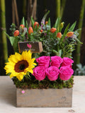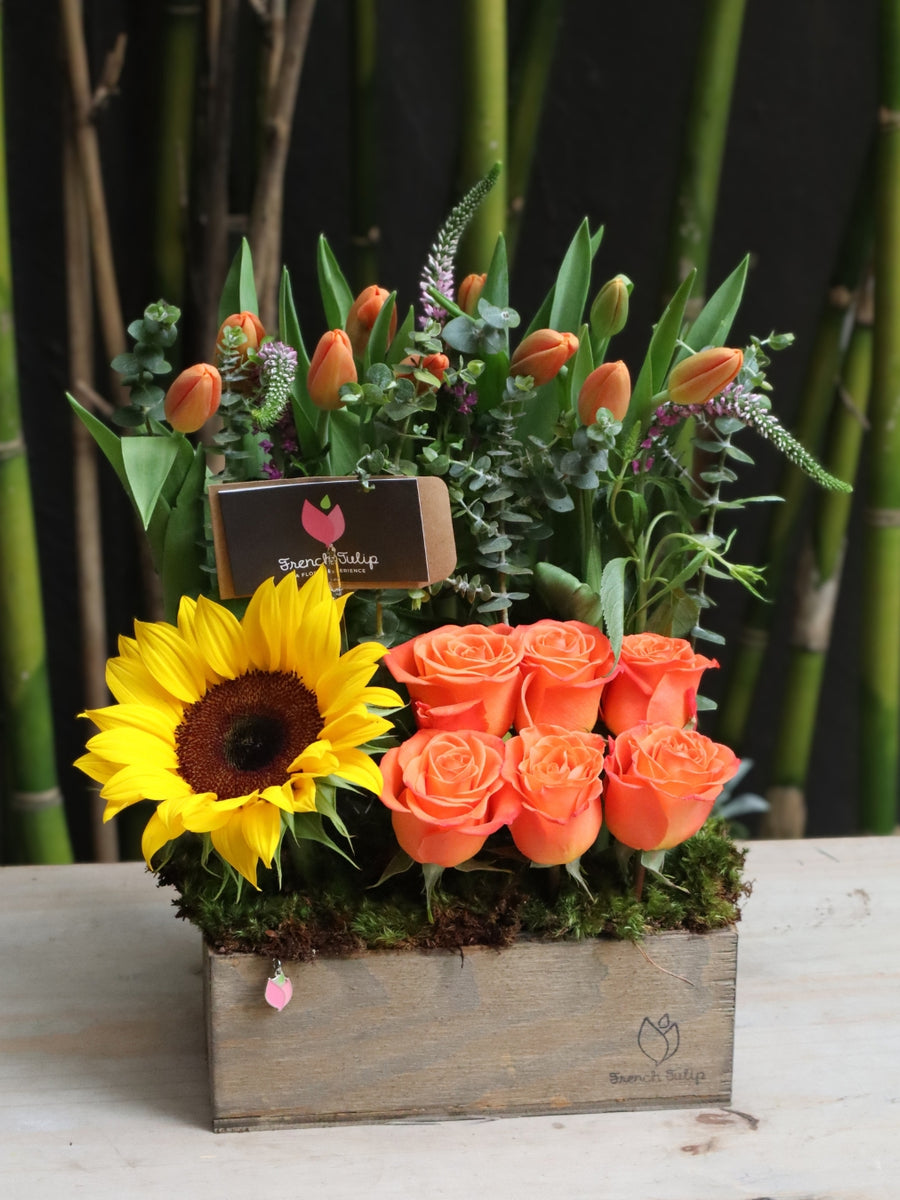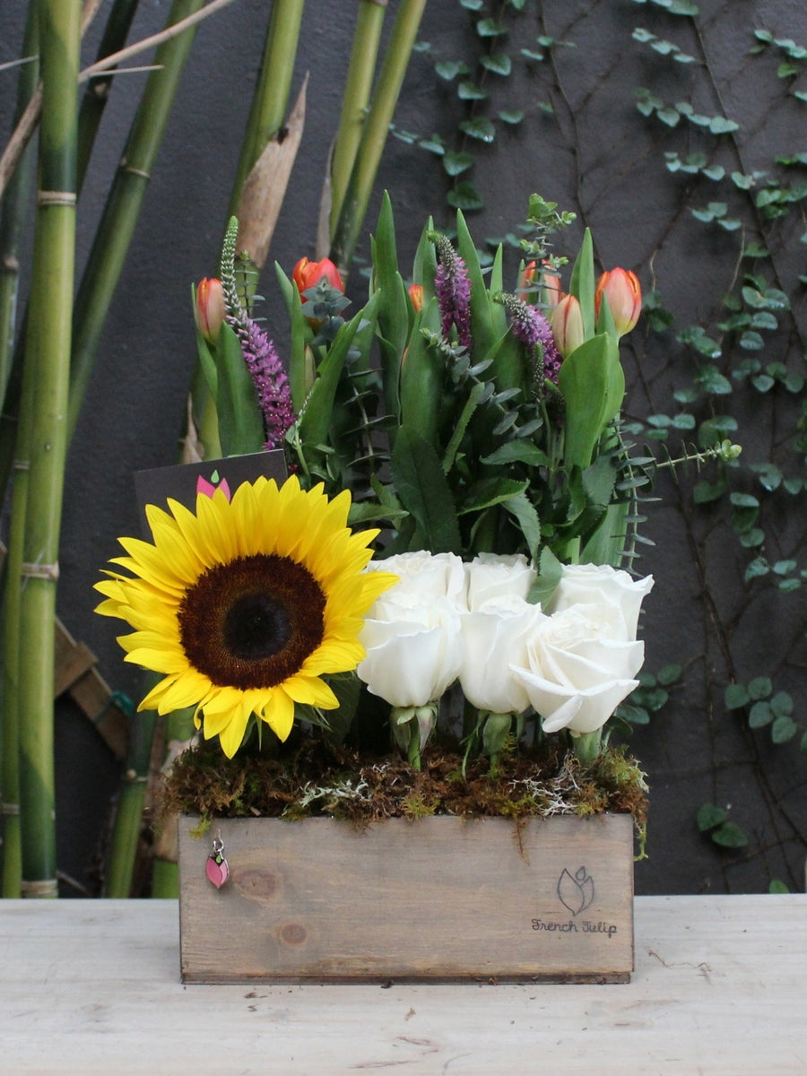 Brighten up any office with a Sunny Notes floral arrangement! This 5x10 wooden vase floral arrangement is the perfect way to celebrate administrative assistants, filled with bold and vibrant tulips, roses, veronicas, sunflowers, and eucalyptus. Make an impression and show appreciation with this special gift!