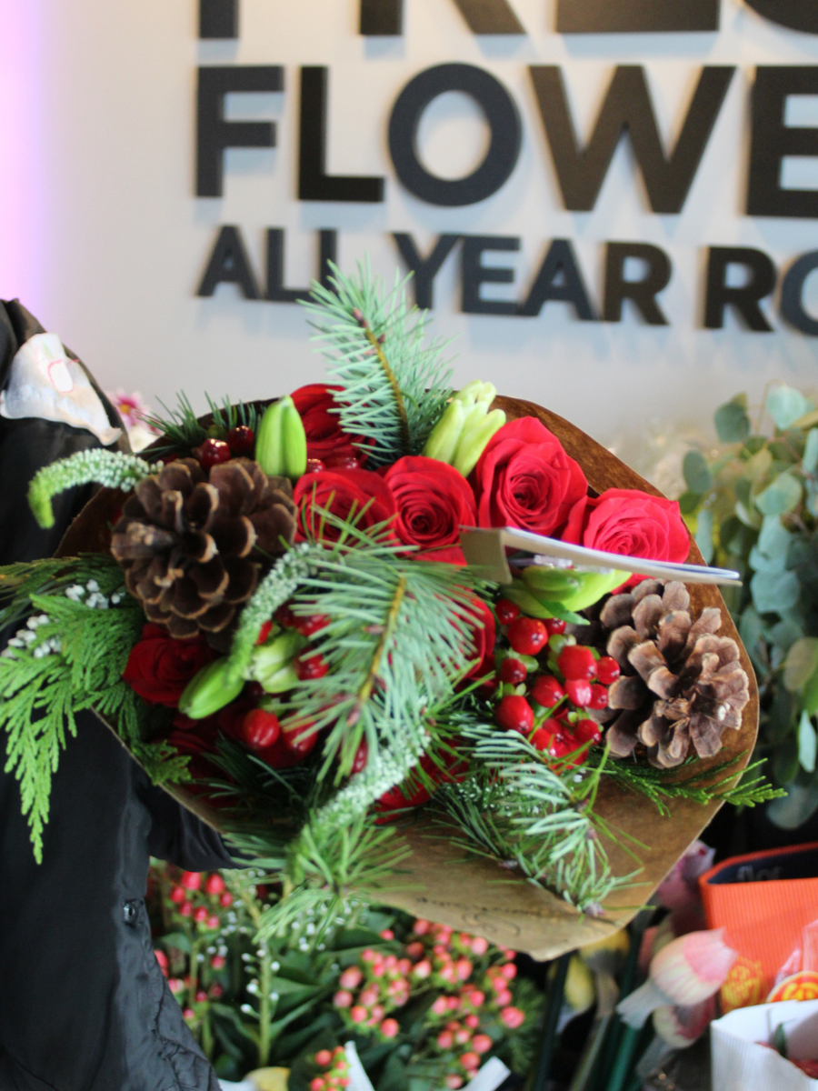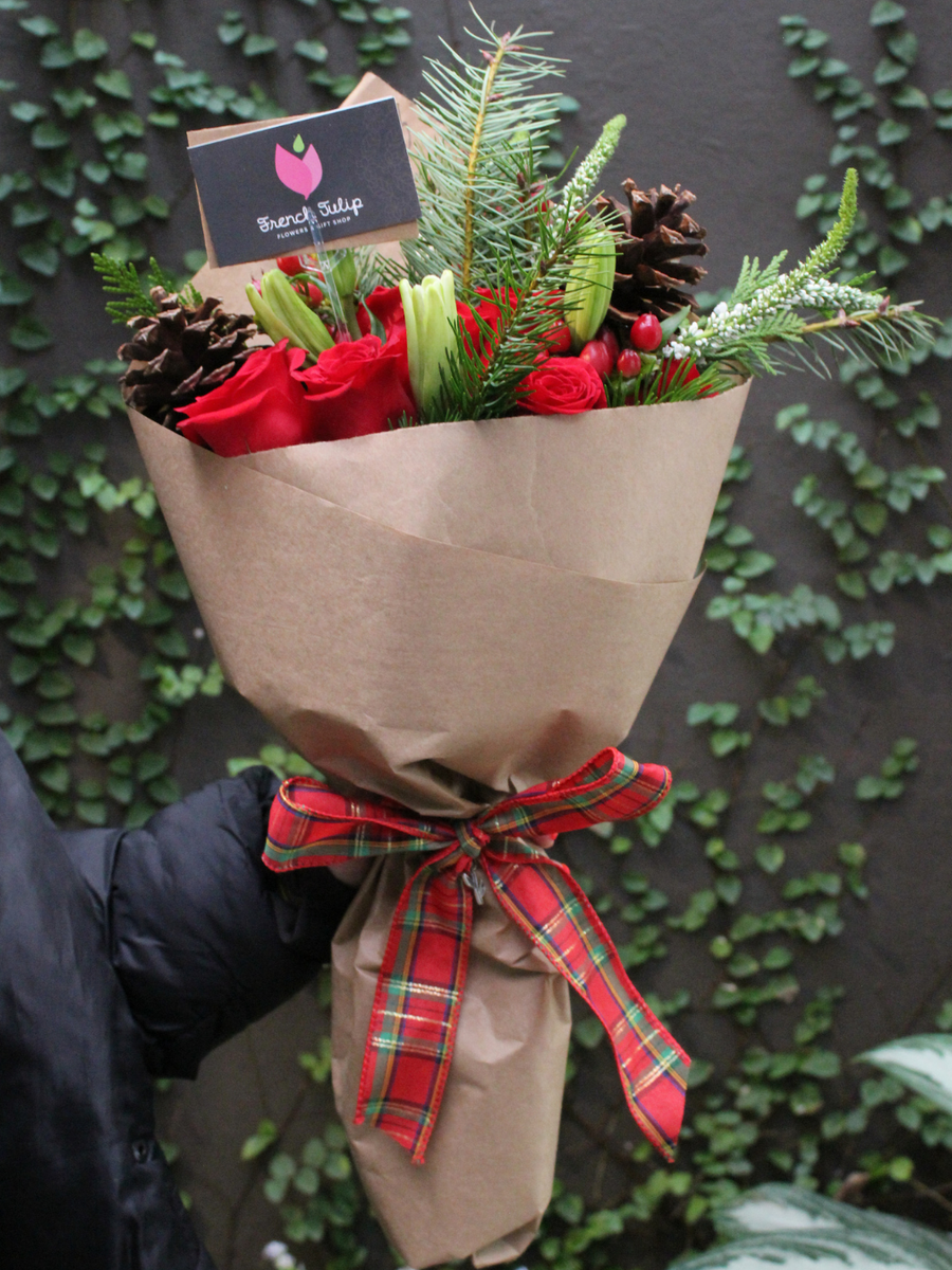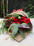 Greet the holidays with Magic Holly - a round bouquet of red roses, lilies, ilex berries, veronicas, mixed pine, and pinecones that will bring a festive touch to any home! Create a beautiful centerpiece, or turn a special occasion even more magical with this aromatic and eye-catching floral arrangement.