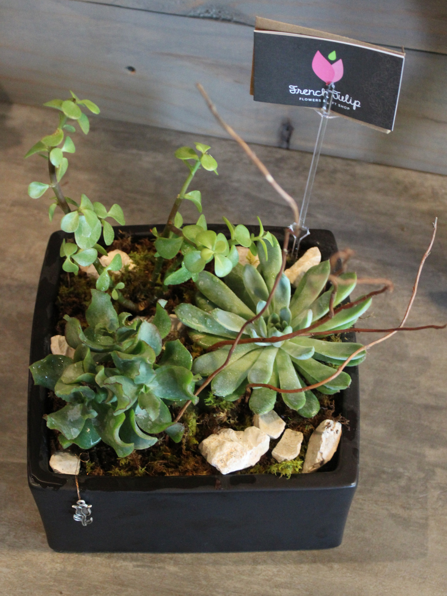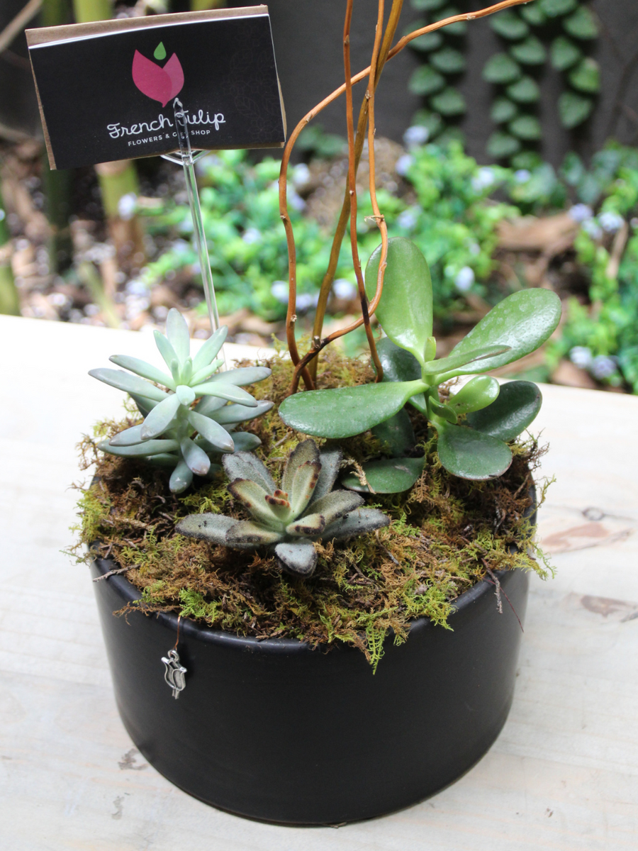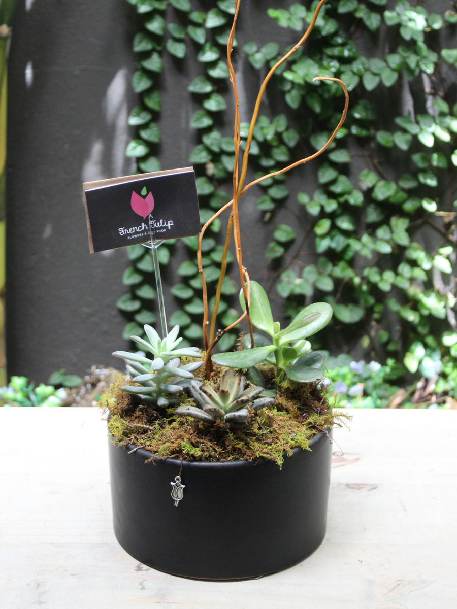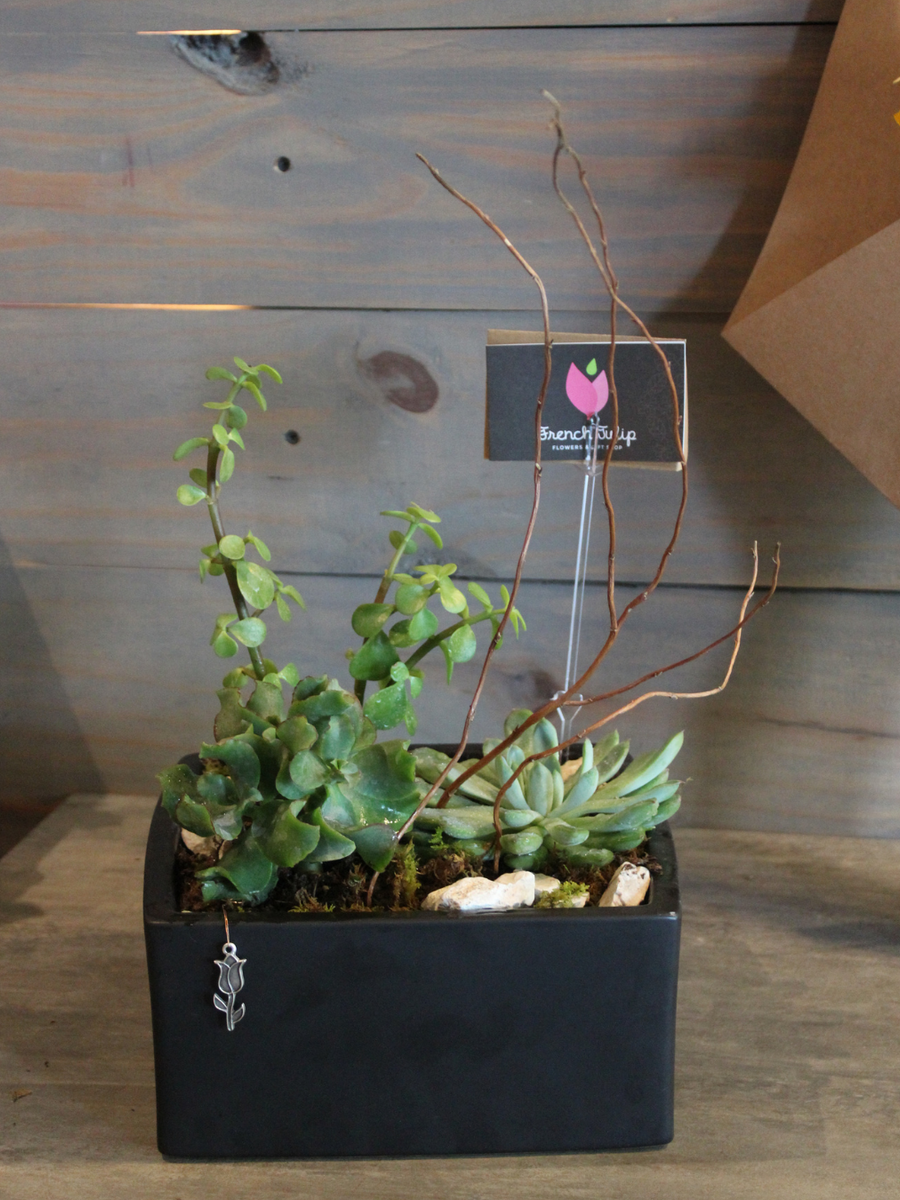 This elegant Plants Arrangement in a ceramic black vase is perfect for a long-lasting gift. With low-maintenance plants and succulents, it's a thoughtful and sophisticated choice. Each arrangement is unique and may vary in plant selection. Upgrade your home or surprise a loved one with this exquisite base.