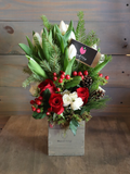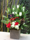 Discover the beauty of the holidays with our sublime Holiday Delight! Featuring a 5x5 wooden base arrangement made of tulips, spray roses, roses, hypericum berries, different types of pine, and pinecones, it will bring the festive spirit into your home. The hues of white, red, and green make this bouquet a perfect addition to any holiday décor!