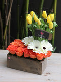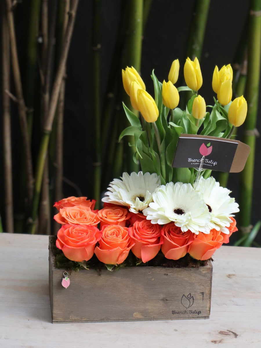 Create a 'Summer Fling' that lasts forever with our beautiful arrangement of tulips, gerbera daisies, and roses. This 5x10 wooden base is the perfect way to show off this precious little garden and make those special moments last a lifetime! What are you waiting for? Get your hands on this perfect summer fling today!