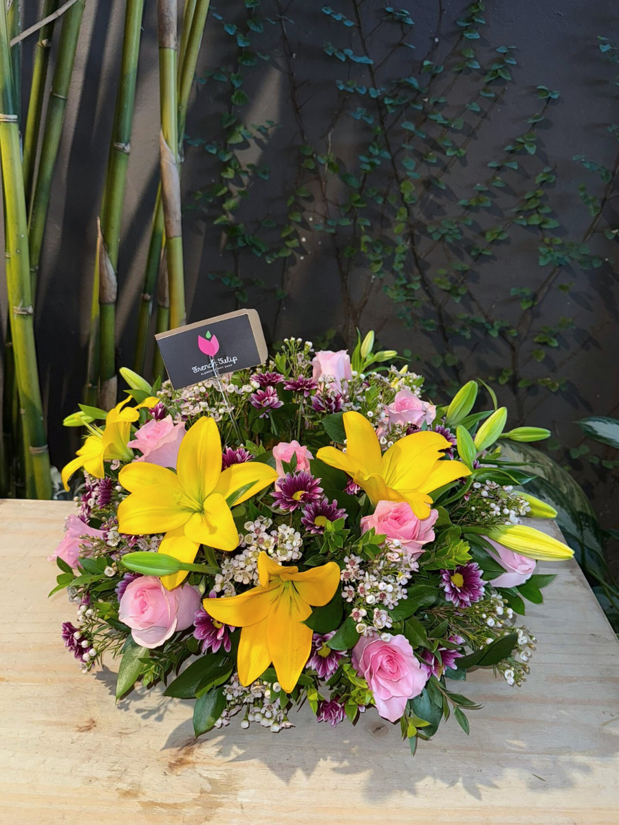 Los colores de las flores en nuestros bouquets y arreglos se trabajan a discreción de los floristas según su disponibilidad.