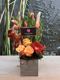 Introducing our premium Maple Fields Fall Collection Arrangement. Handcrafted in a handmade 5x5 wooden vase, this arrangement features stunning Tulips, Gerbera, Rosas, and autumn leaves, accented with preserved hay stems and myrtle. Bring the hues of autumn into your home or give as a the most perfect 'anytime' gift.