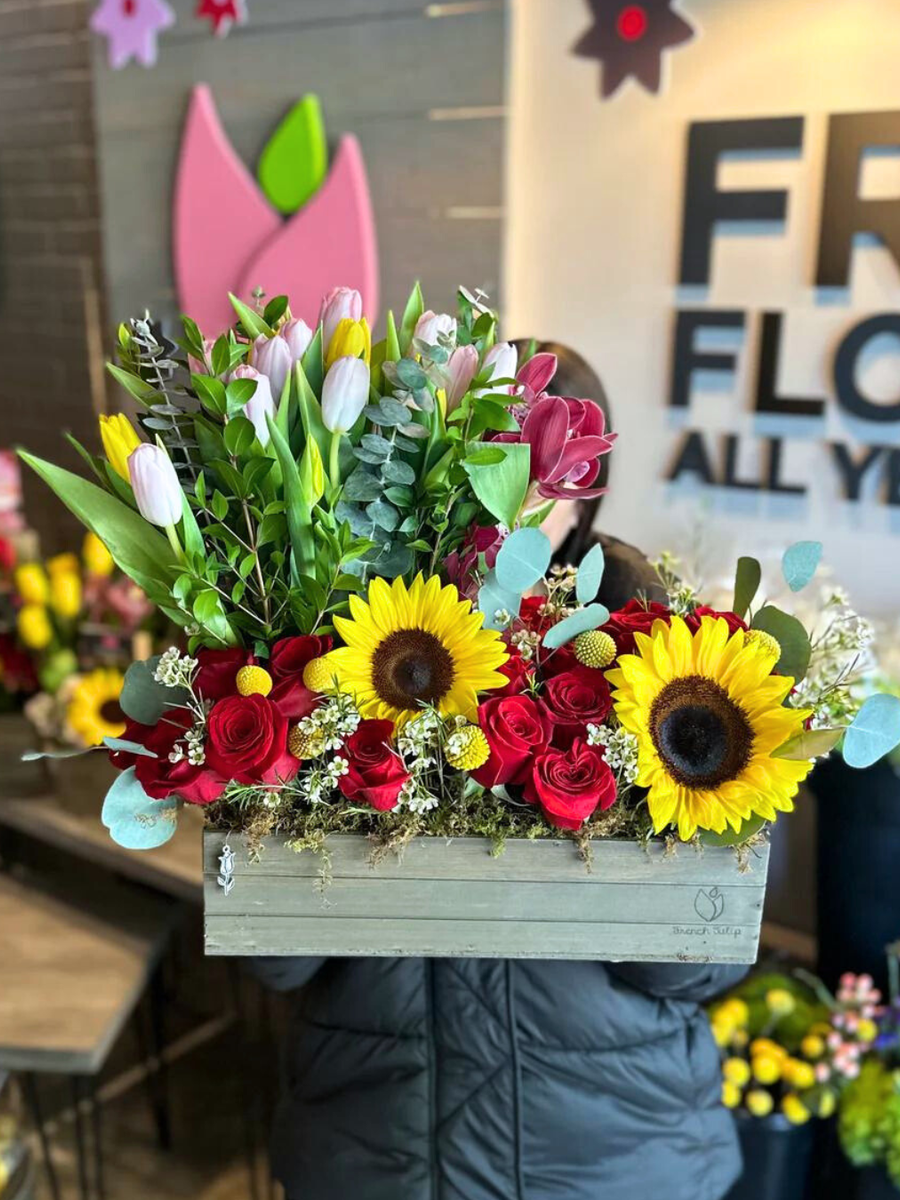 Happily Ever After - Elegant Flower Arrangement in Wooden Base | French Tulip PR Celebrate everlasting love with the "Happily Ever After" flower arrangement from French Tulip. This elegant arrangement features a beautiful selection of fresh flowers, thoughtfully arranged in a handcrafted wooden base. It’s the perfect expression of romance and commitment for anniversaries, or any special occasion.