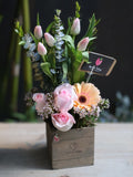 Say "thank you" with 'Mommy's Joy,' an exquisite floral arrangement of orchids, tulips, gerbera daisies, and roses on a 5x5 wooden base. Celebrate Mom's Day with a special gift that will show your appreciation in an unforgettable way!