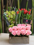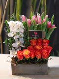The 'P.S. I Love You' arrangement is the perfect way to express your heartfelt sentiments. It features a beautiful mix of roses, orchids, tulips, and lavender in an elegant arrangement that is perfect for any occasion. Make them feel extra special with this special delivery!