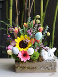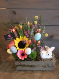 Lift your spirits and make your Easter celebration bloom with Bunny Kisses! Our vibrant spring collection features a gorgeous floral arrangement in a rustic crate vase, with Easter eggs, and a cuddly bunny to bring abundant joy and happiness. Transform your home into a sweet wonderland, and add edibles for extra special surprises. Let the Easter magic begin!