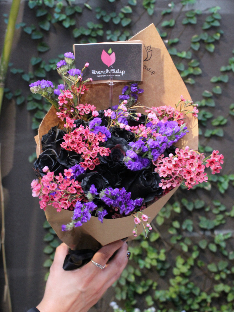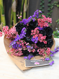 Treat yourself or your loved ones to a spooky surprise with a Midnight Magic bouquet - a Halloween-inspired flower arrangement featuring mysterious black roses, scarlet waxflower, and purple statice. Trick-or-treat with this special seasonal treat! Este arreglo estará disponible por tiempo limitado.