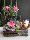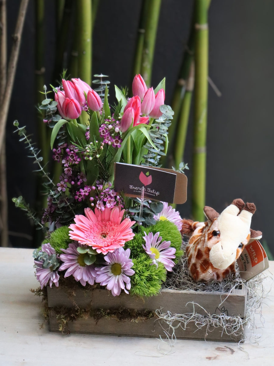 Celebrate new beginnings with Tiny Smile! This lush arrangement features tulips, gerbera, daisies, dianthus, and eucalyptus blue, along with a cute plush toy. A perfect tribute to birth, this makes a thoughtful gift for new families or newborn parents. *The items outside the vase are for display purposes only. Sold separately.*