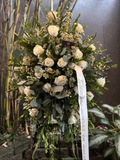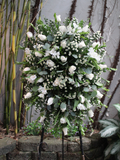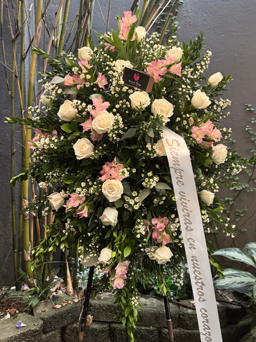Corona floral para tributo funebre. Las ordenes de arreglos fúnebre por nuestra página web se trabajan para el siguiente día en adelante. Si necesitas el arreglo para el mismo día, no dude en llamarnos al 787-200-6760 y con gusto le ayudamos. *Los colores de las flores varían según la disponibilidad.