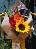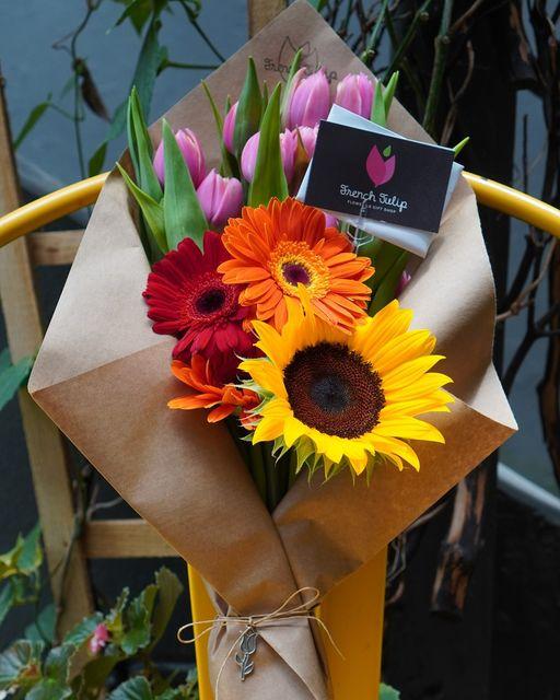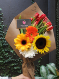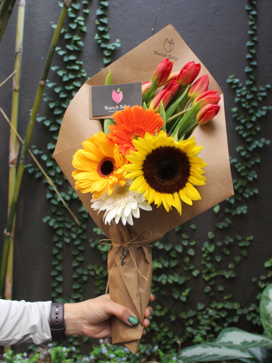 Get ready to feel Young & Beautiful with this vibrant bouquet! Featuring 10 tulips, 3 gerbera daisies, and a sunflower, it's sure to brighten anyone's day. Add a touch of color and cheer to your space, or surprise someone special with this lovely arrangement.